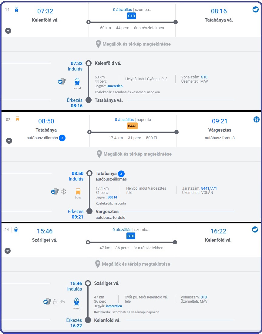órakor indul Tatabányára és 08:16 órára ér oda. Utána 08:50 órakor indul a busz Várgesztes autóbusz-fordulóhoz és 09:21 órára ér oda.(1 120,- Ft a vonat jegy + 500,- Ft a busz jegy) |
