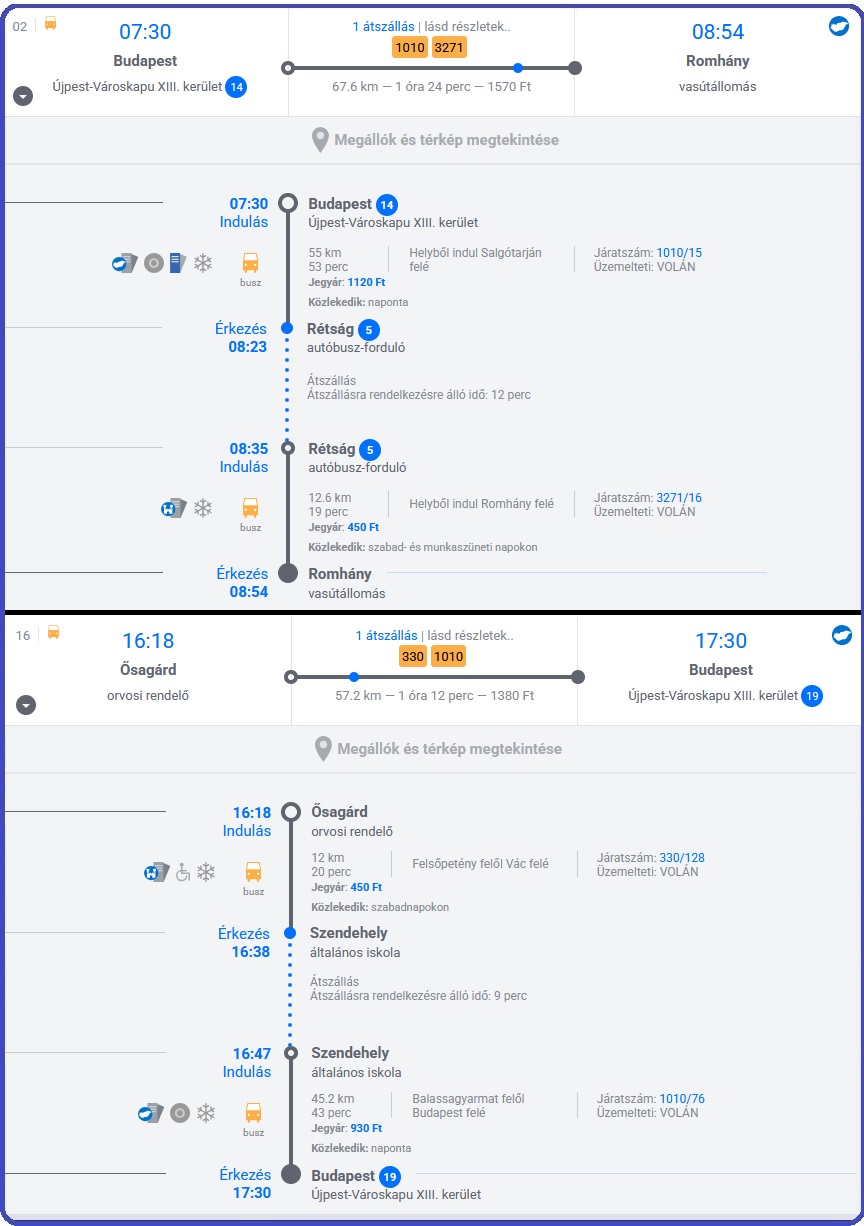 | Utazás vissza: | 16:18 órakor Ősagárd Orvosi rendelő - 16:38 óra Szendehely Általános iskola (450.- Ft) - 17:30 Budapest Újpest-Városkapu XIII. kerület (930.- Ft) |