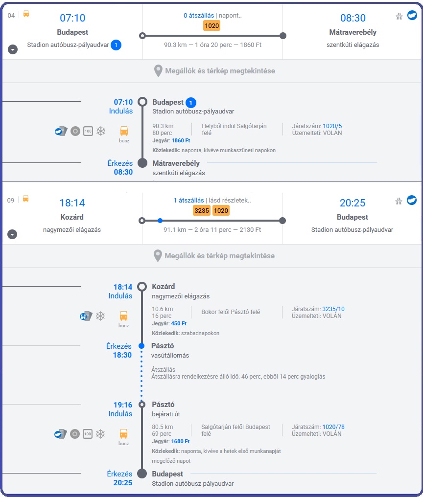 | Utazás vissza: | 18:14 órakor Kozár, Nagymezői elágazás - 18:30 órára Pásztóra érkezés (450.- Ft) - átszállás - 19:16 óra Pásztó - érkezés 20:25 óra Budapest Stadion autóbusz pu. (1 680.- Ft) |